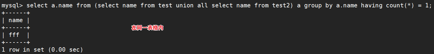 (select 相同字段 from 表格1 union all select 相同字段 from 表格2) 别名 group by 别名.相同字段 having count(*) = 1;