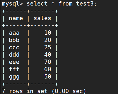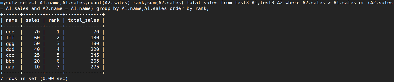 select A1.Name, A1.Sales, SUM(A2.Sales) test3 ,count(A2.Sales) Rank from test3 A1,test3 A2 where A2.Sales > A1.Sales or (A2.Sales = A1.Sales and A2.Name >= A1.Name) GROUP BY A1.Name,A1.Sales ORDER BY rank;