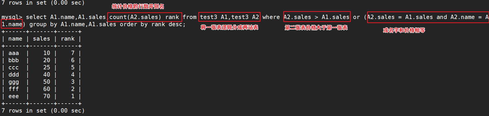select A1.Name, A1.Sales,count(A2.Sales) Rank from test3 A1, test3 A2 where A2.Sales > A1.Sales or (A2.Sales = A1.Sales and A2.Name >= A1.Name) GROUP BY A1.Name,A1.Sales ORDER BY rank;