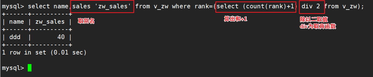 select name,sales 'zw.sales' from v_zw where rank=(select (count(rank)+1) div 2 from v_zw);