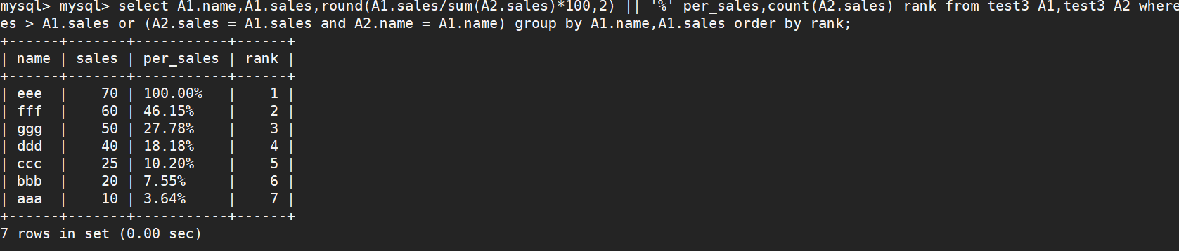 select A1.Name, A1.Sales, ROUND(A1.Sales/(select sum(A2.Sales) from test3)*100,2) || '%' Per_Sales l,count(A2.Sales) Rank from test3 A1, test3 A2 where A2.Sales > A1.Sales or (A2.Sales = A1.Sales and A2.Name >= A1.Name) GROUP BY A1.Name,A1.Sales ORDER BY rank;