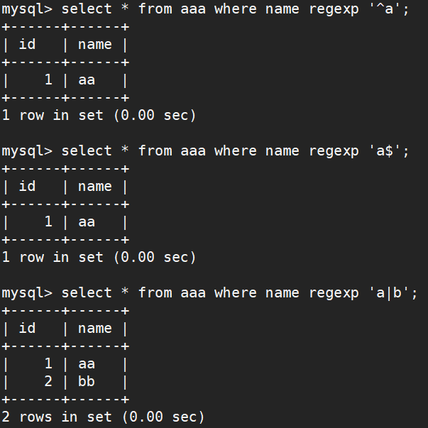 select 字段 from 表名 where 字段 regexp '正则表达式';