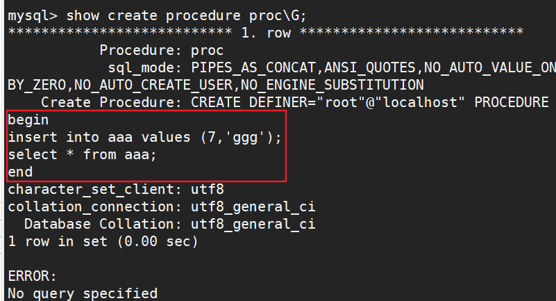 show create procedure [数据库.] 存储过程名; #查看某个储存过程的具体信息