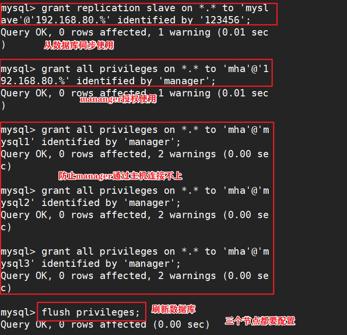 grant all privileges on *.* to 'mha'@'192.168.80.%' identified by 'manager'; #manager 使用
