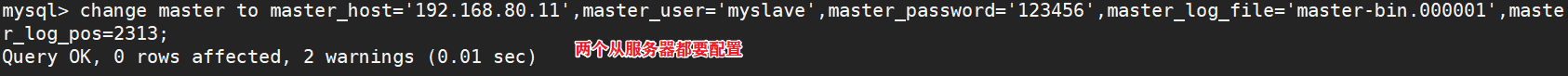 change master to master_host='192.168.80.10',master_user='myslave',master_password='123456',master_log_file='master-bin.000001',master_log_pos=2313;