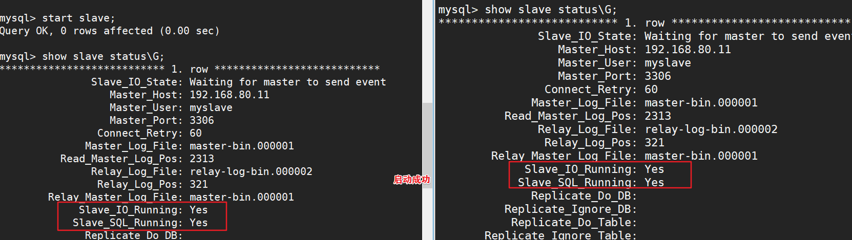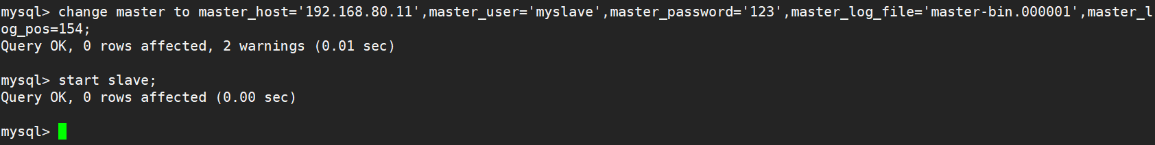 change master to master_host='192.168.80.11',master_user='myslave',master_password='123',master_log_file='master-bin.000001',master_log_pos=154;