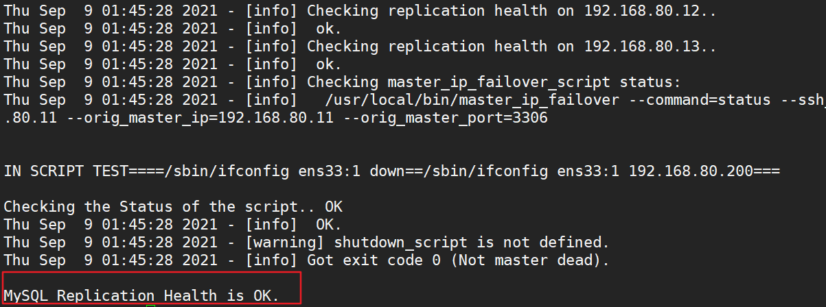 - 2.3.9、在 manager 节点上测试 mysql 主从连接情况,最后出现 MySQL Replication Health is OK 字样说明正常
