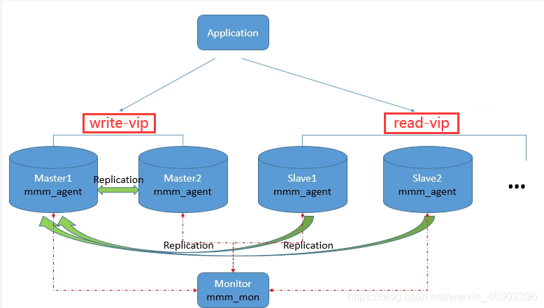 (双主)复制,虽然叫做双主复制,但是业务上同一时刻只允许对一个主进行写入,另一台备选主上提供部分读服务,以加速在主主切换时备选主的预热,可以说MMM这套脚本程序一方面实现了故障切换的功能,另一方面其内部附加的工具脚本也可以实现多个slave的read负载均衡