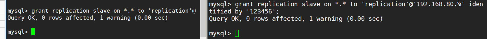 grant replication slave on *.* to 'replication'@'192.168.80.%' identified by '123456';