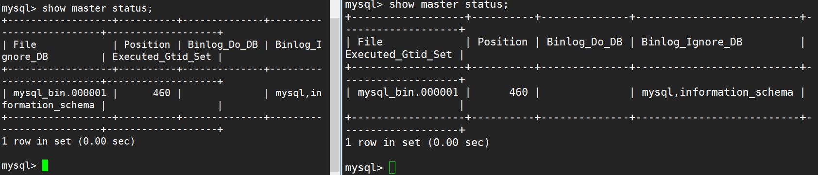 #在两台主服务器上查看,记录日志文件名称和同步点