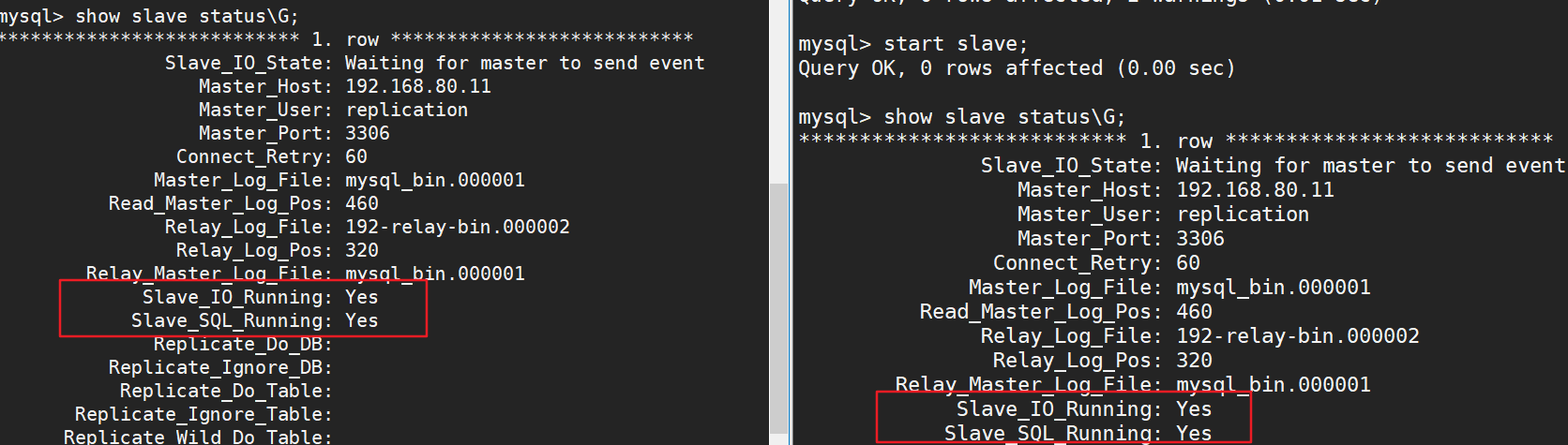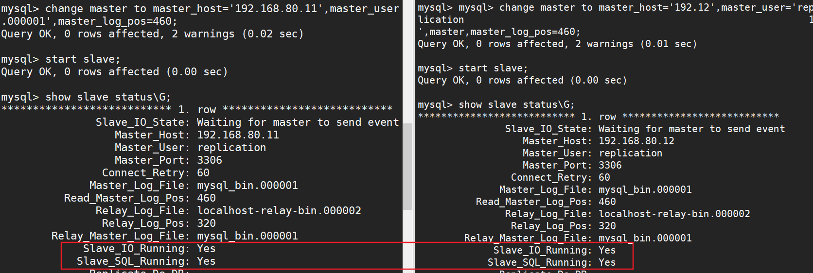 change master to master_host='192.168.80.11',master_user='replication',master_password='123456',master_log_file='mysql_bin.000001',master_log_pos=460;