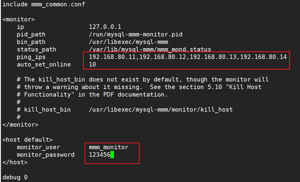 - 2.3.3、在 monitor 监控服务器上修改监控配置文件 mmm_mon.conf