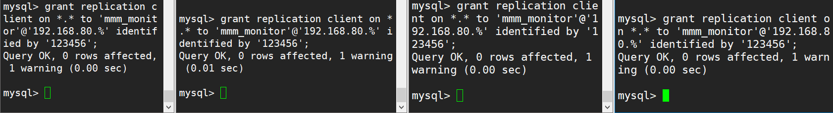grant replication client on *.* to 'mmm_monitor'@'192.168.80.%' identified by '123456';