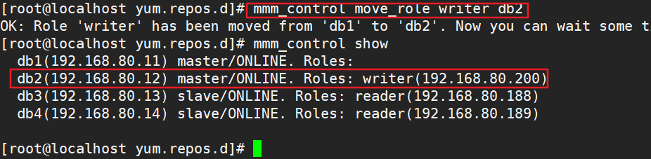 db1(192.168.80.11) master/ONLINE. Roles: writer(192.168.80.200)