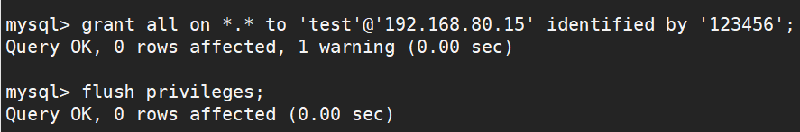 grant all on *.* to 'test'@'192.168.80.15' identified by '123456';