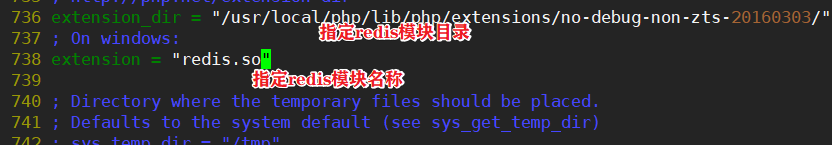 extension_dir = "/usr/local/php/lib/php/extensions/no-debug-non-zts-20160303/" #736行,指定redis模块目录