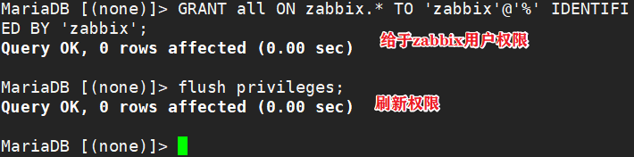 GRANT all ON zabbix.* TO 'zabbix'@'%' IDENTIFIED BY 'zabbix';
