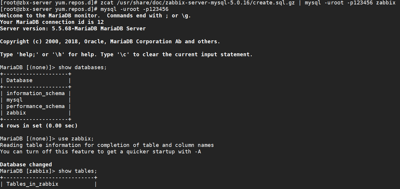zcat /usr/share/doc/zabbix-server-mysql-5.0.15/create.sql.gz | mysql -uroot -123456 zabbix