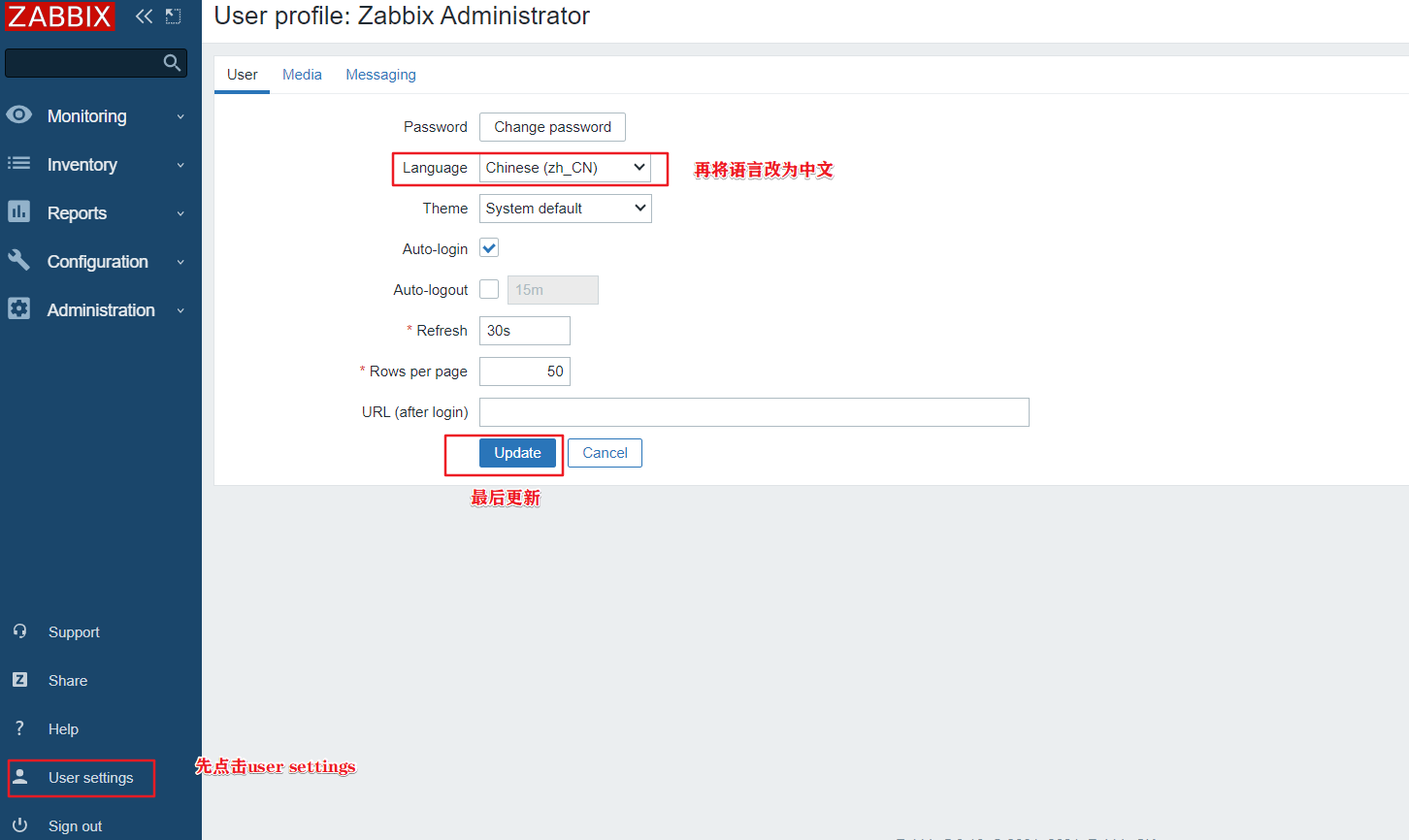 设置文件界面:点击左边菜单栏的【User settings】,【Language】选择 Chinese(zh_CN),再点击 Update 更新。