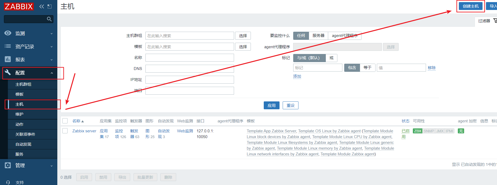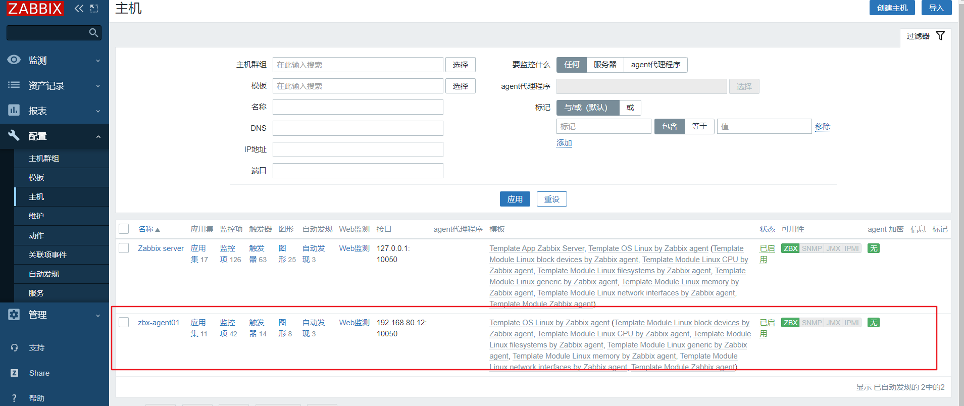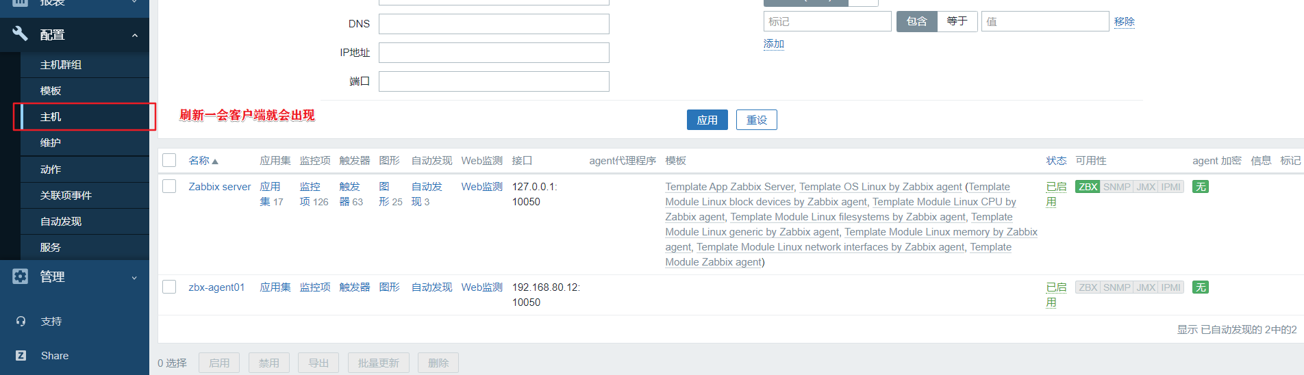 点击左边菜单栏【配置】中的【主机】刷新,等待一段时间后即可刷新出自动发现的客户端主机