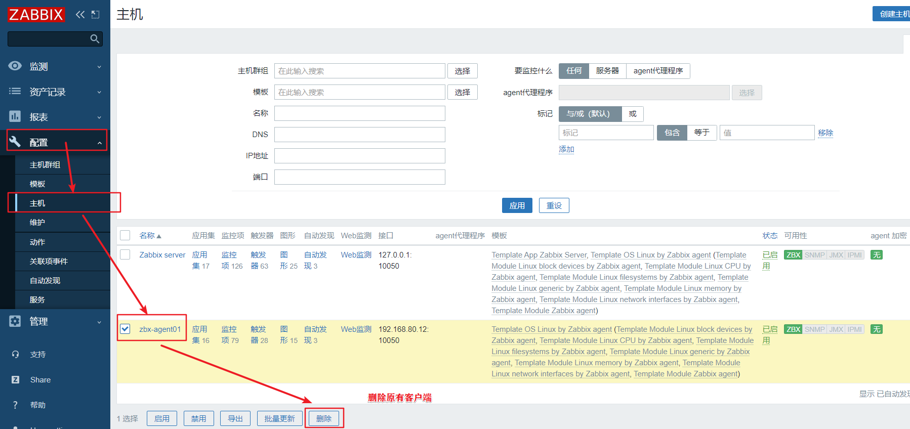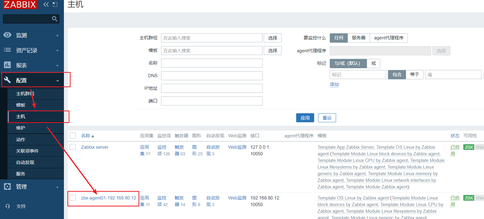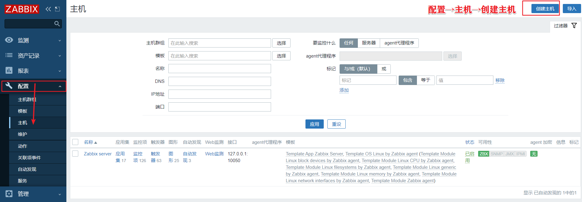 点击左边菜单栏【配置】中的【主机】刷新,等待一段时间后即可刷新出自动发现的客户端主机