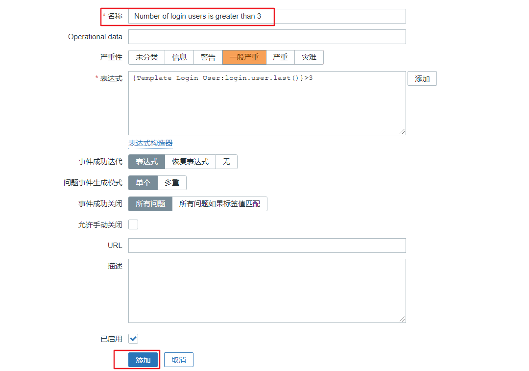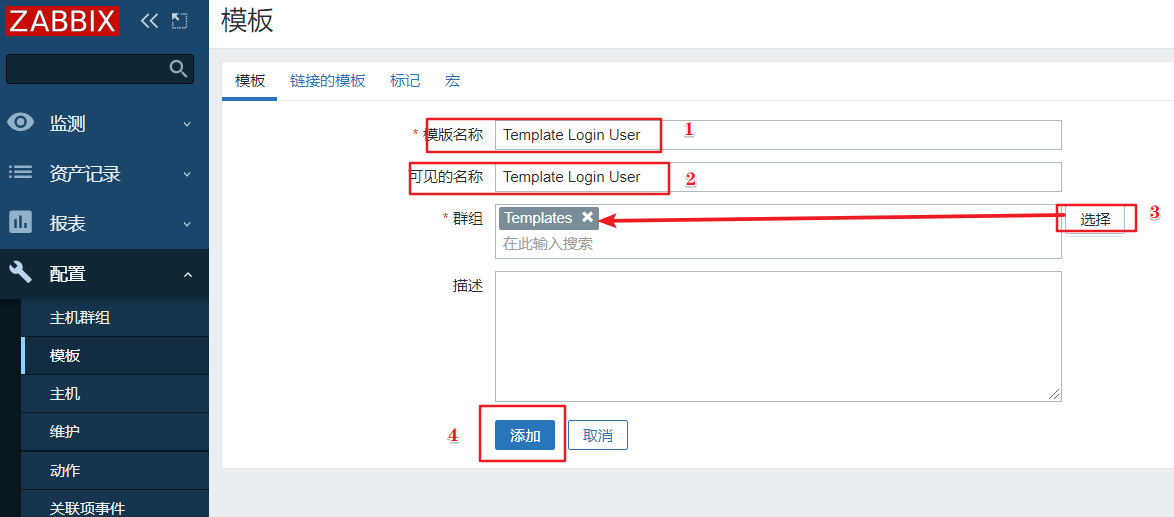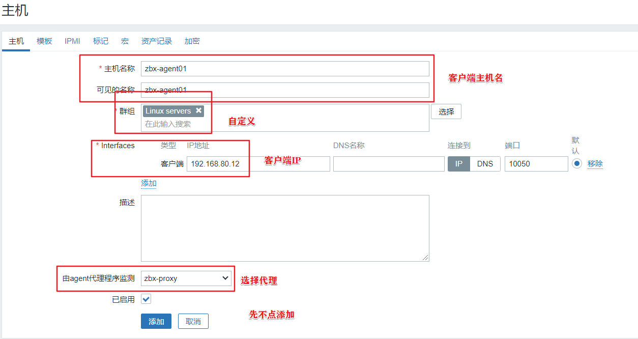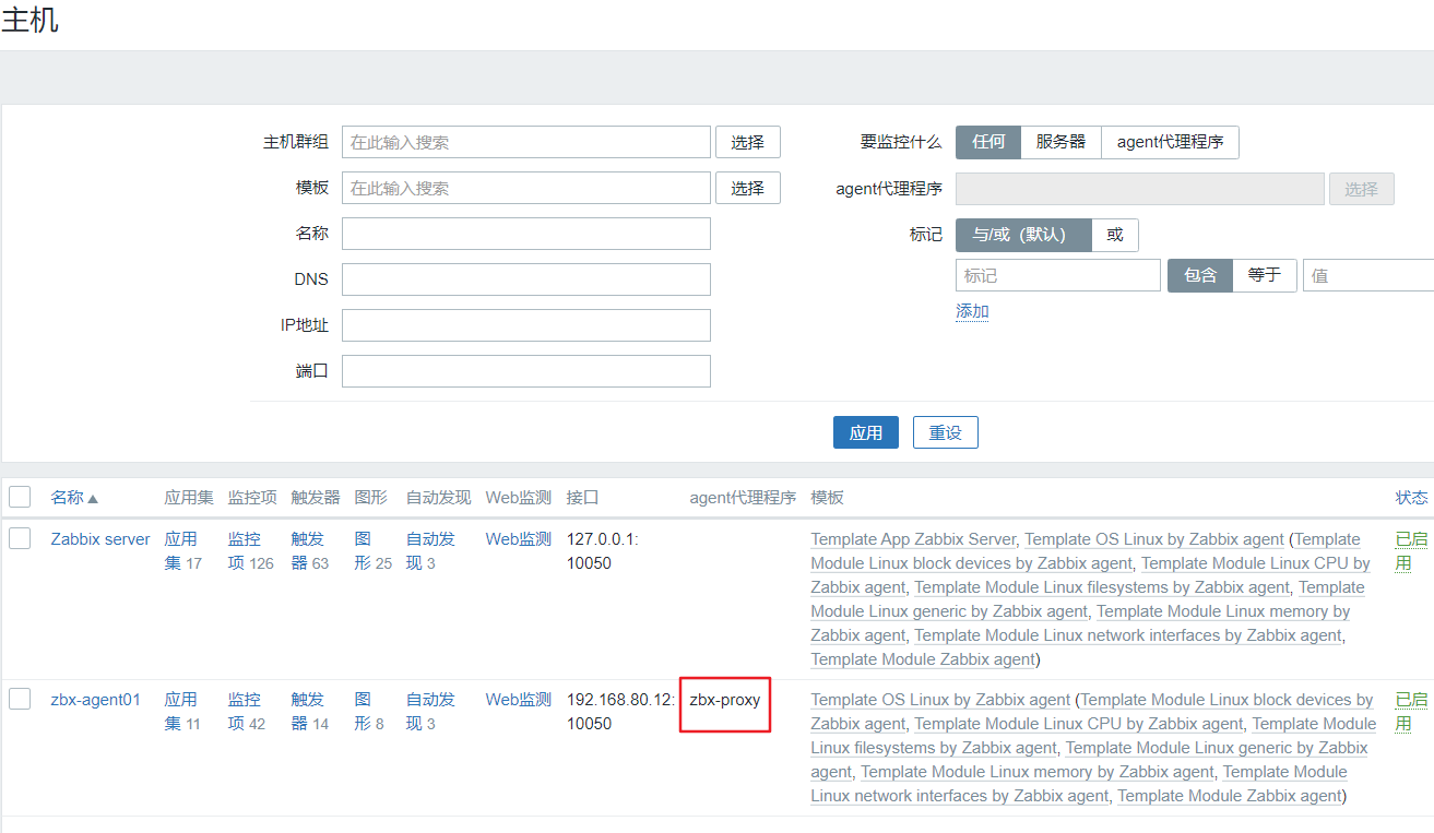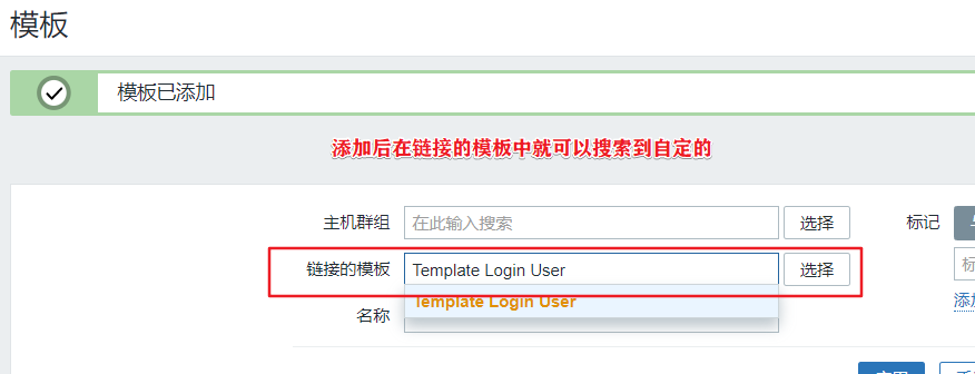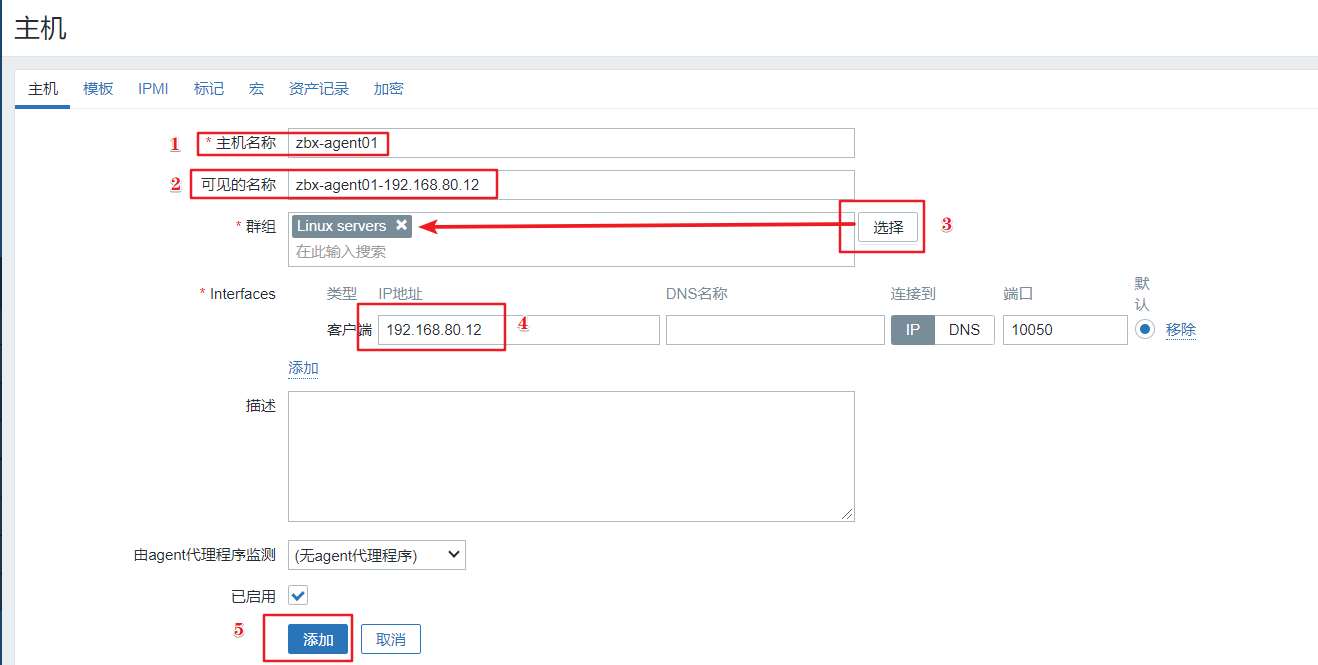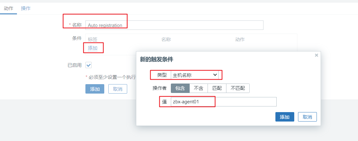 点击 【添加】,【类型】选择 主机名称,【操作者】选择 包含,【值】设置成 zbx-agent01