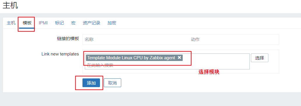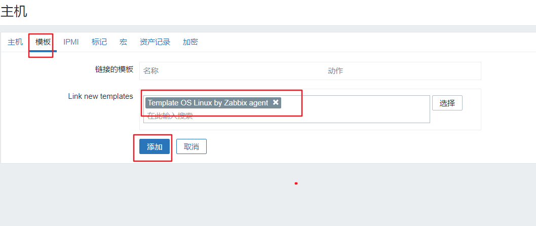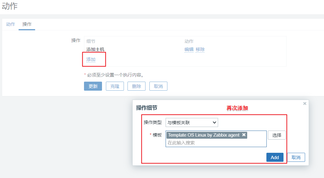 再点击【添加】,【操作类型】选择 与模板关联,【模板】搜索 Linux,选择 Template OS Linux by Zabbix agent,点击 【add】