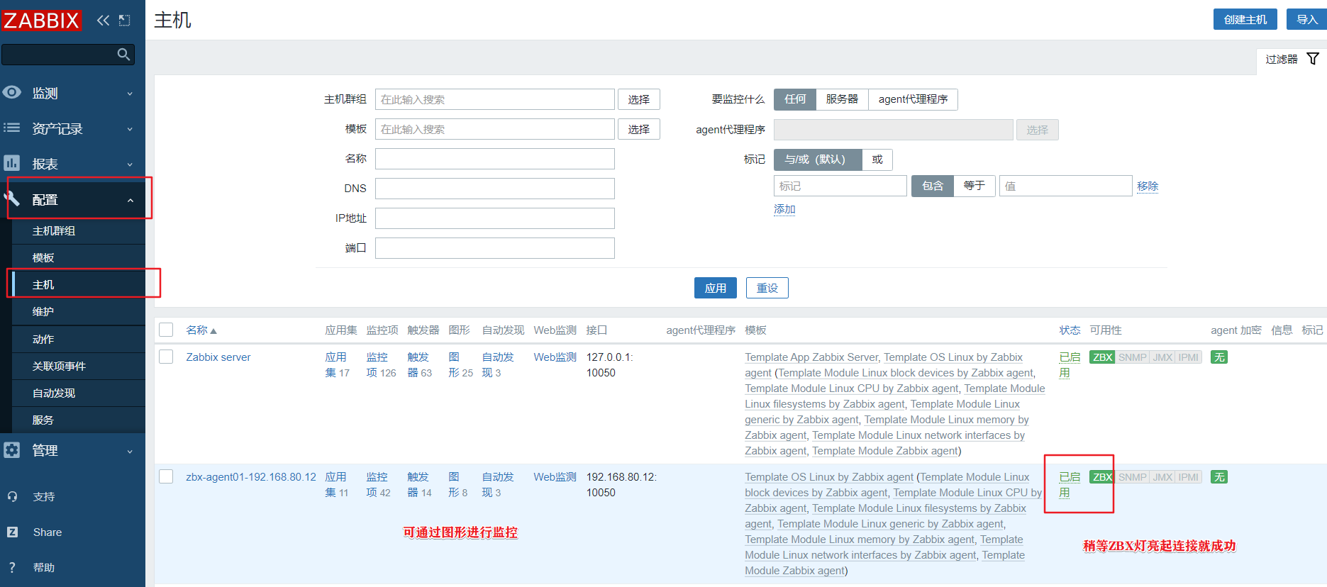 点击左边菜单栏【配置】中的【主机】刷新,查看客户端主机监控状态正常