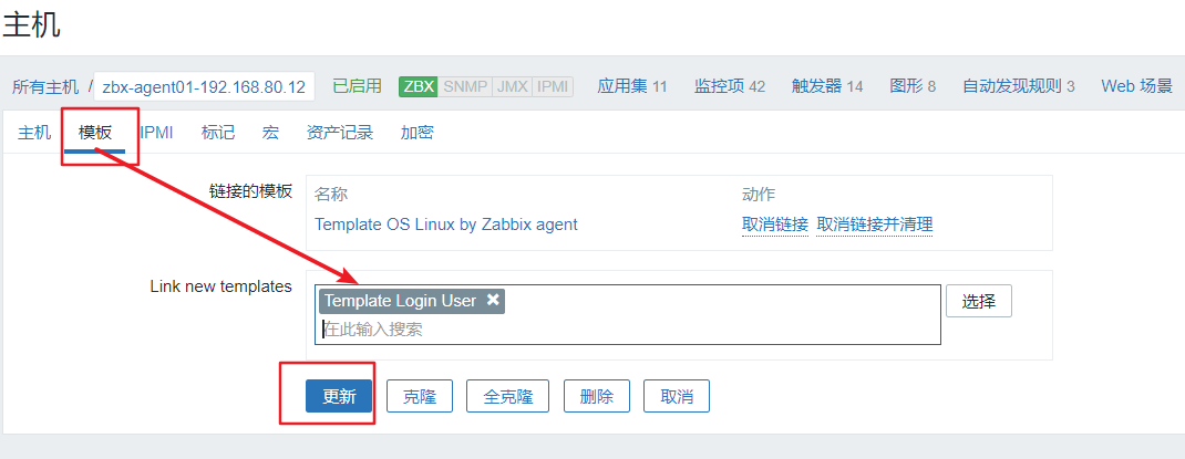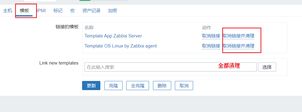 点击上方菜单栏【模板】,【链接的模板】中的所有 agent 模板选择取消链接并清理