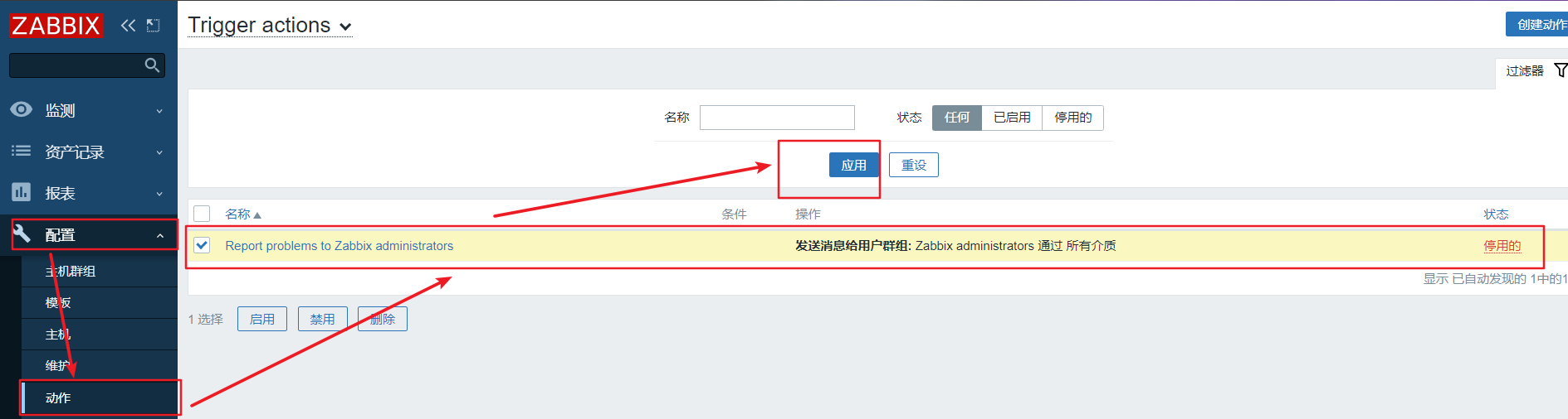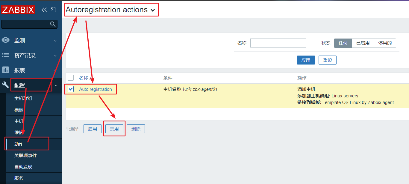 点击左边菜单栏【配置】中的【动作】,勾选自动注册规则,点击 禁用