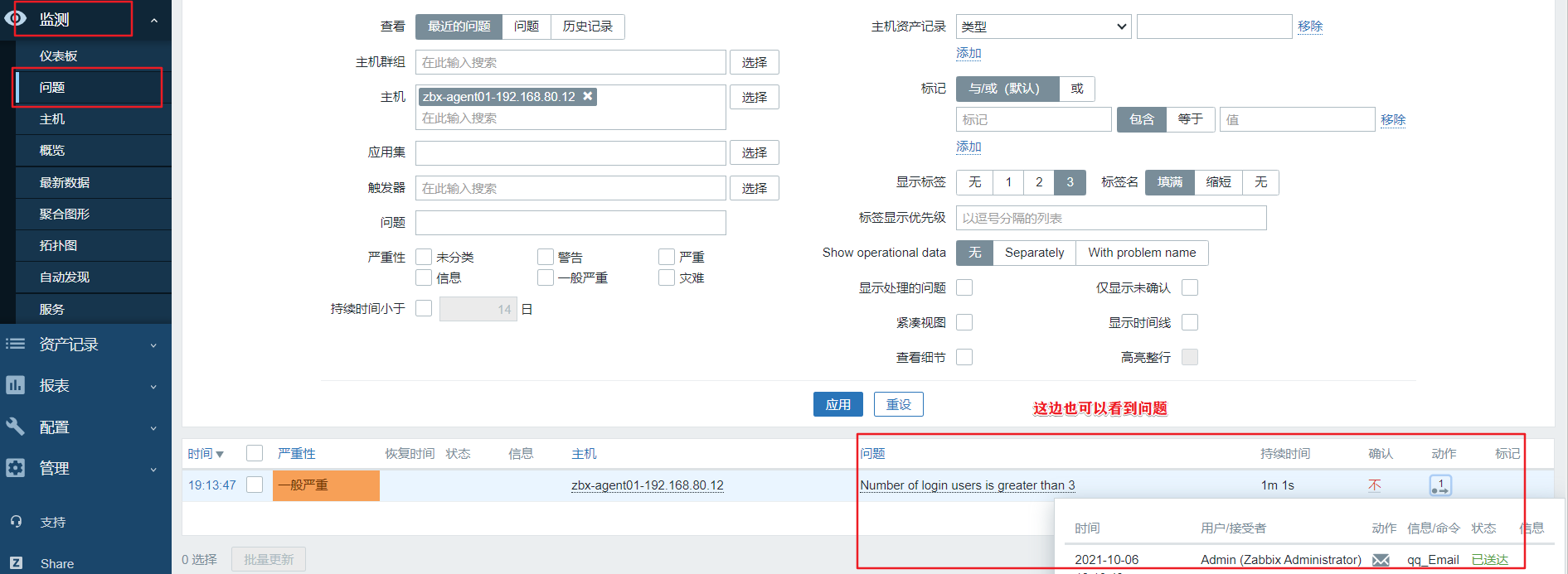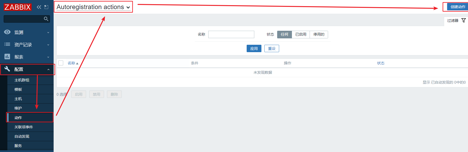 点击左边菜单栏【配置】中的【动作】,上方菜单选择 【Discovery actions】