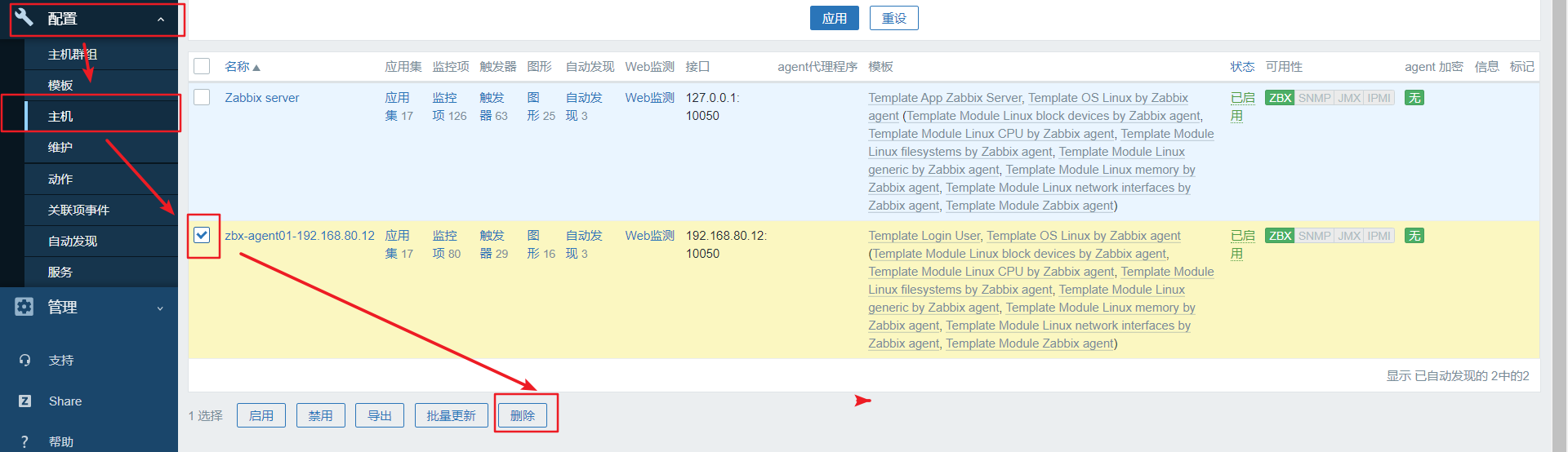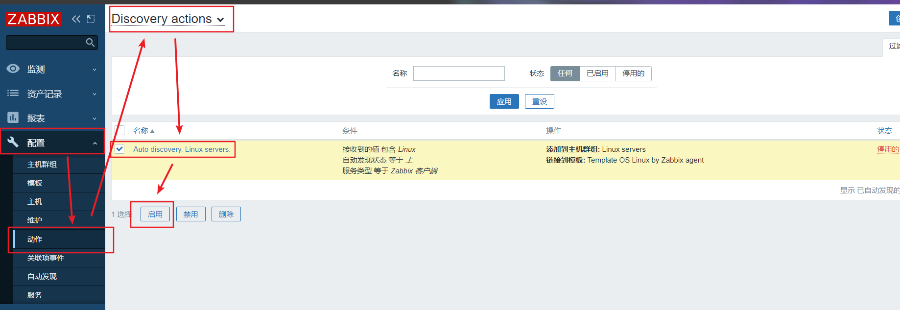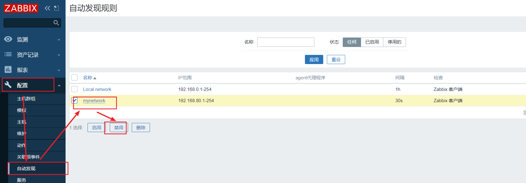 点击左边菜单栏【配置】中的【自动发现】,勾选发现规则,点击 禁用