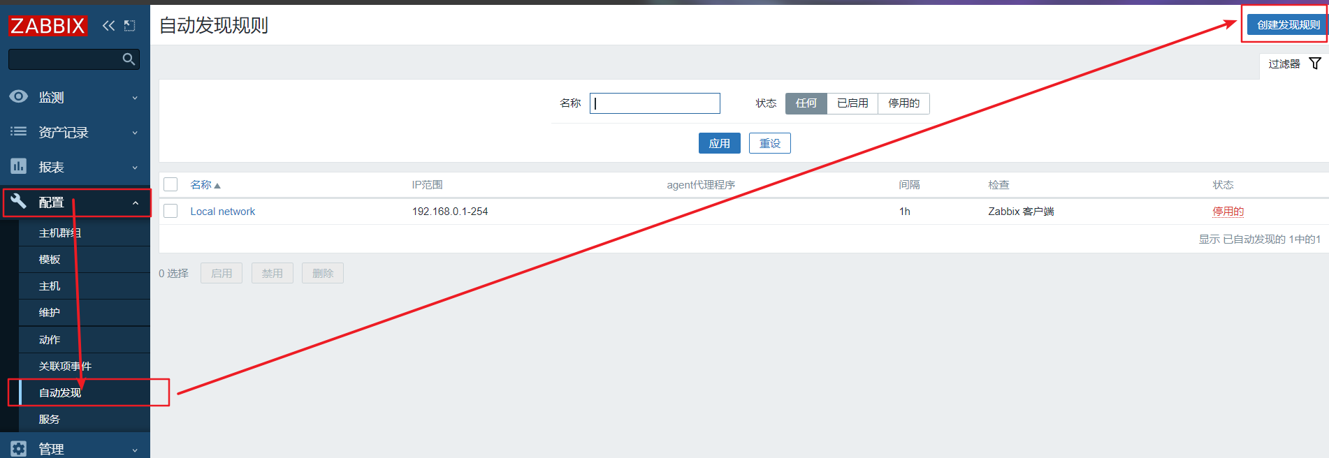 点击左边菜单栏【配置】中的【自动发现】,点击【创建发现规则】