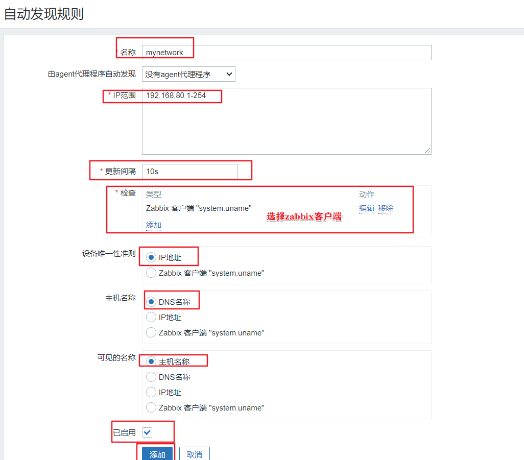 【检查】点击【添加】,【检查类型】选择 Zabbix 客户端,【端口范围】设置成 10500,【键值】设置成 system.uname