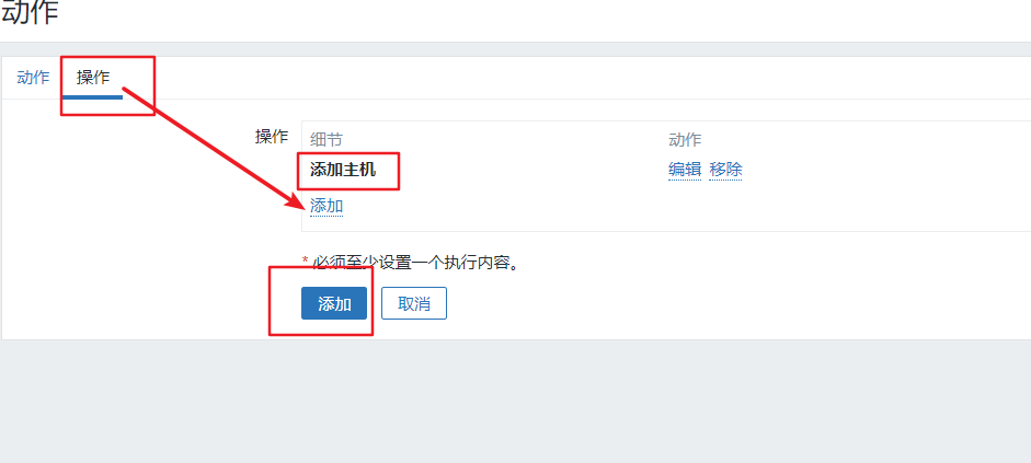 点击上方菜单栏【操作】,点击【添加】,【操作类型】选择 添加主机,点击 【add】