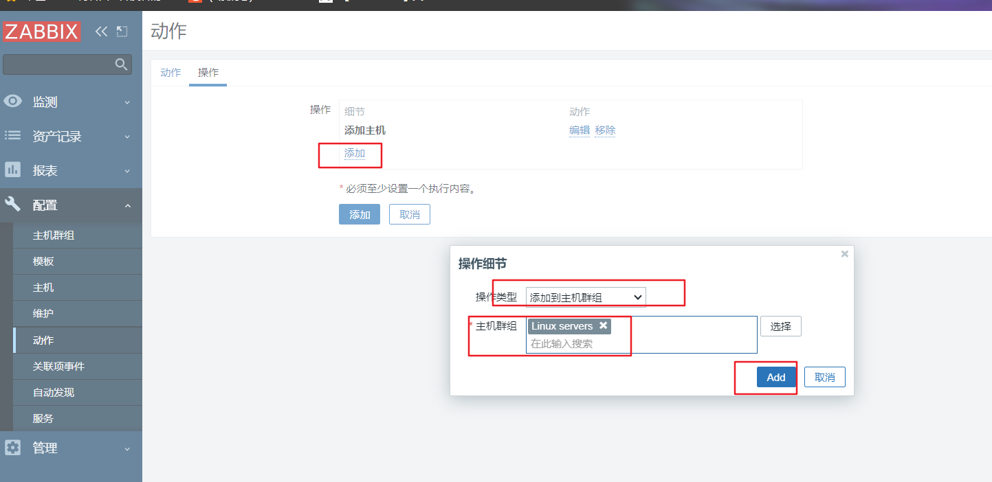 再点击【添加】,【操作类型】选择 添加到主机群组,【主机群组】选择 Linux servers,点击 【add】