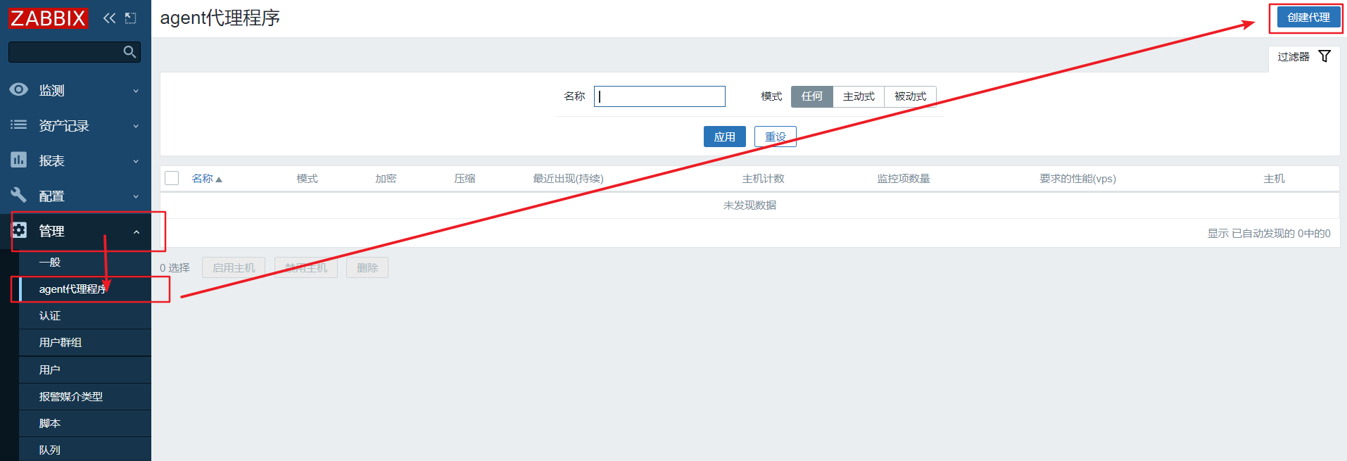 点击左边菜单栏【管理】中的【agent代理程序】,点击【创建代理】