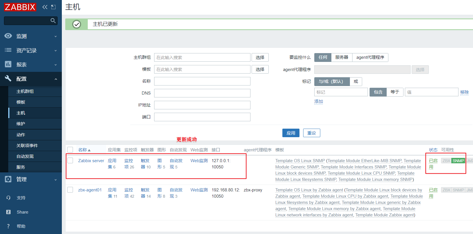 点击 【更新】,等待一段时间后 Zabbix server 的可用性就变成了 SNMP 监控方式。