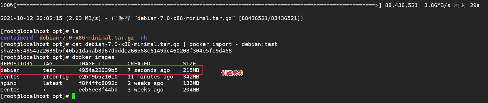 cat debian-7.0-x86-minimal.tar.gz | docker import - debian:test