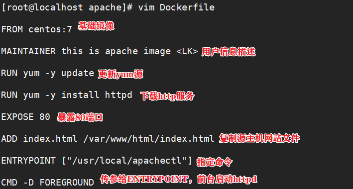 RUN yum -y install httpd #镜像操作指令安装apache软件