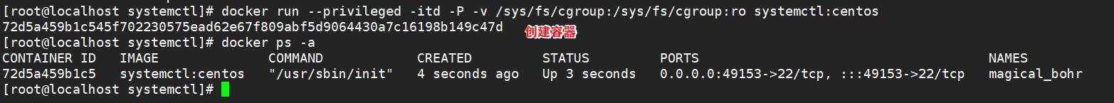 docker run --privileged -d -P -v /sys/fs/cgroups:/sys/fs/cgroup:ro systemd:centos /sbin/init