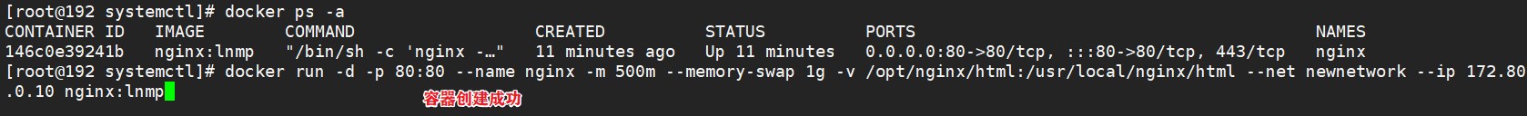 docker run -d --name nginx -p 80:80 -v /opt/nginx/html:/usr/local/nginx/html --net newnetwork --ip 172.80.0.10 nginx:lnmp