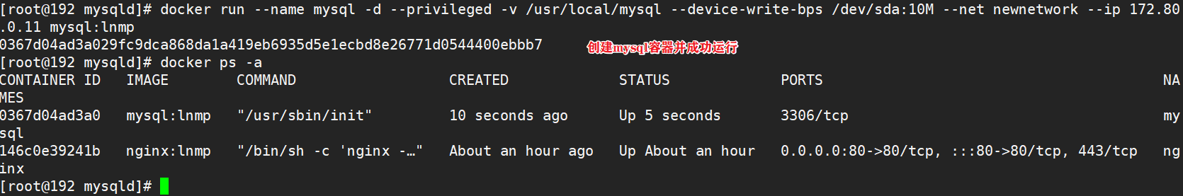 docker run --name=mysql -d --privileged -v /usr/local/mysql --net mynetwork --ip 172.80.0.11 mysql:lnmp