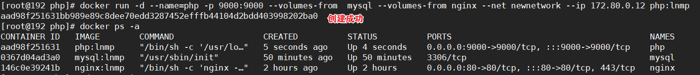 docker run --name=php -d -p 9000:9000 --volumes-from mysql_server --volumes-from nginx --net mynetwork --ip 172.18.0.12 php:lnmp