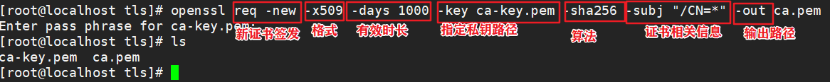 openssl req -new -x509 -days 1000 -key ca-key.pem -sha256 -subj "/CN=*" -out ca.pem #输入123456