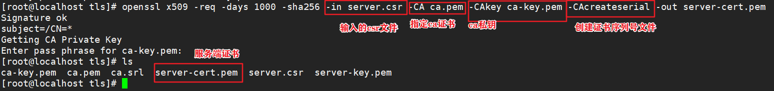 openssl x509 -req -days 1000 -sha256 -in server.csr -CA ca.pem -CAkey ca-key.pem -CAcreateserial -out server-cert.pem