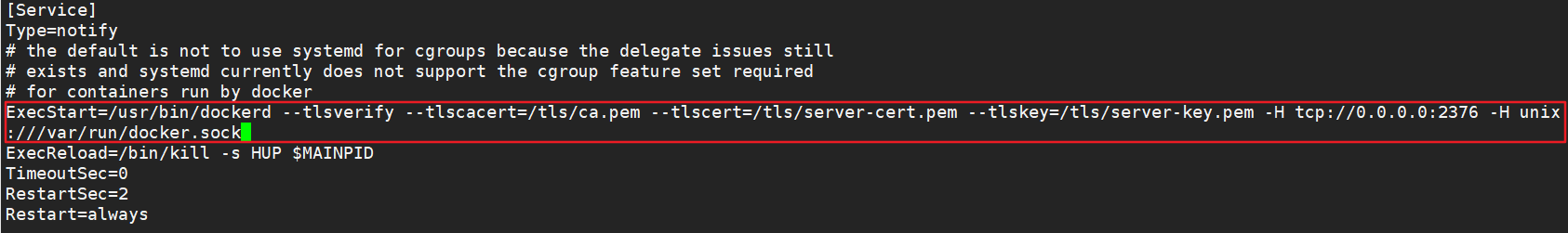 ExecStart=/usr/bin/dockerd --tlsverify --tlscacert=/tls/ca.pem --tlscert=/tls/server-cert.pem --tlskey=/tls/server-key.pem -H tcp://0.0.0.0:2376 -H unix:///var/run/docker.sock