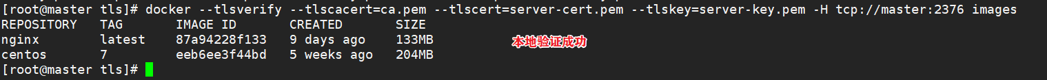 docker --tlsverify --tlscacert=ca.pem --tlscert=server-cert.pem --tlskey=server-key.pem -H tcp://master:2376 images