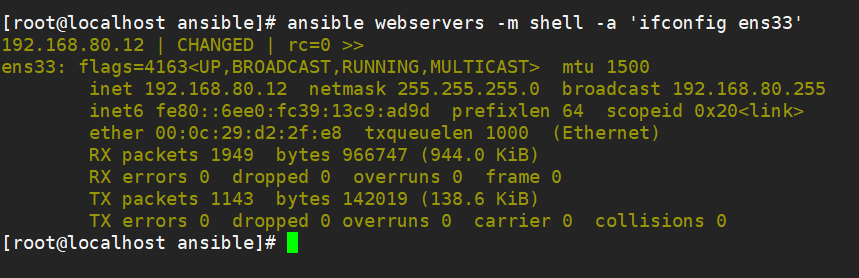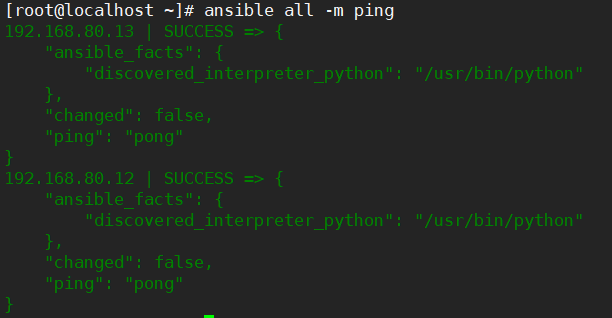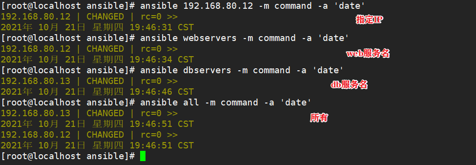 ansible 192.168.80.12 -m command -a 'date' #指定 ip 执行 date