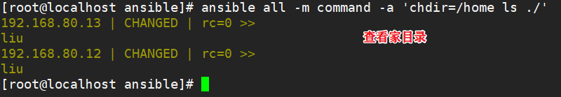ansible all -a 'ls /' #如省略 -m 模块,则默认运行 command 模块